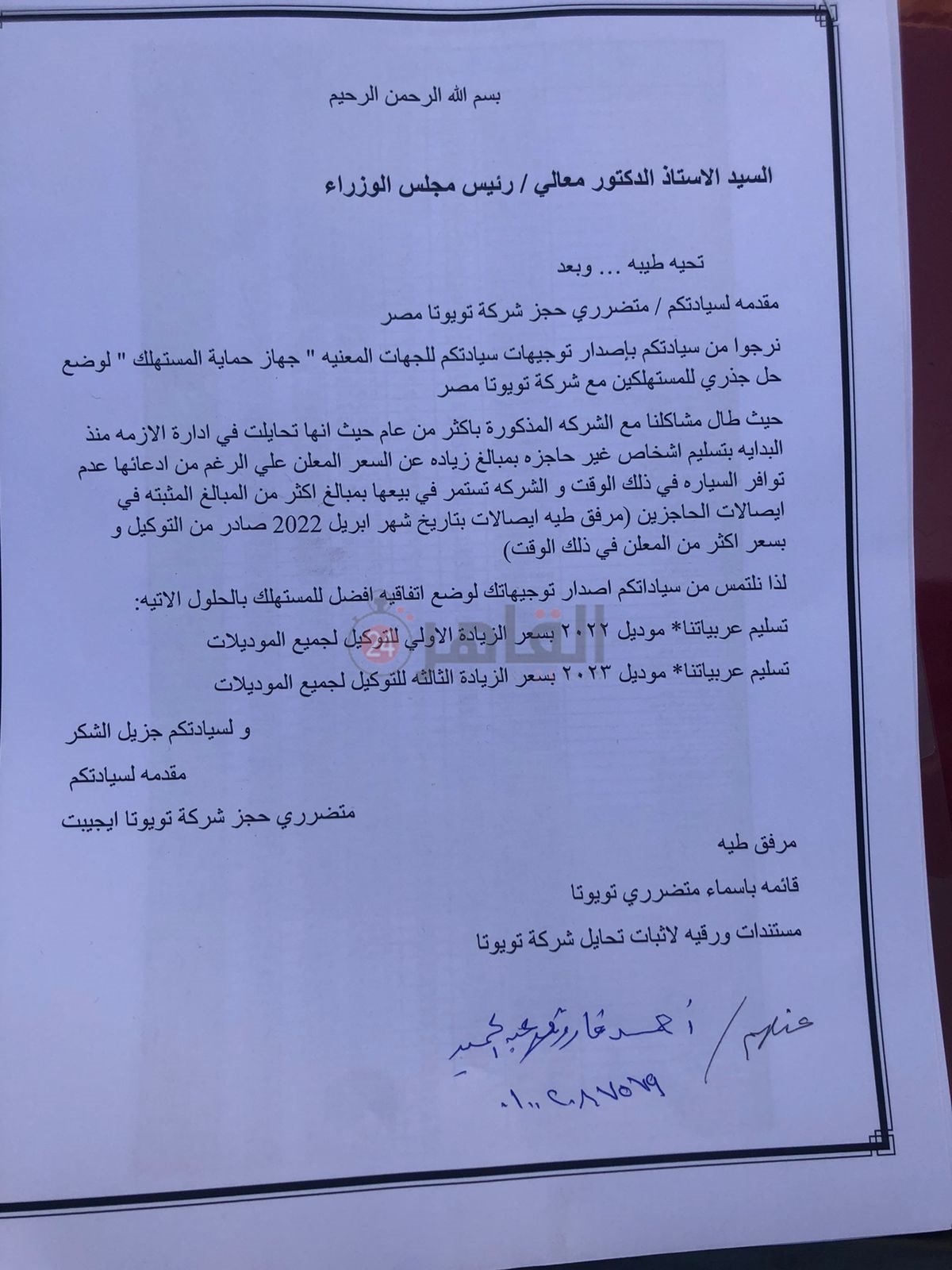 ونصت الشكوى على ما يلي: السيد الدكتور معالي رئيس مجلس الوزرا، تحية طيبة وبعد، مقدمة لسيادتكم من متضرري حجز شركة تويوتا مصر.. نرجوا من سيادتكم بإصدار توجيهات سيادتكم للجهات المعنية لجهاز حماية المستهلك، لوضع حل جذري للمستهلكين مع شركة تويوتا مصر، حيث طالت مشاكلنا مع الشركة المذكورة منذ قرابة عام.