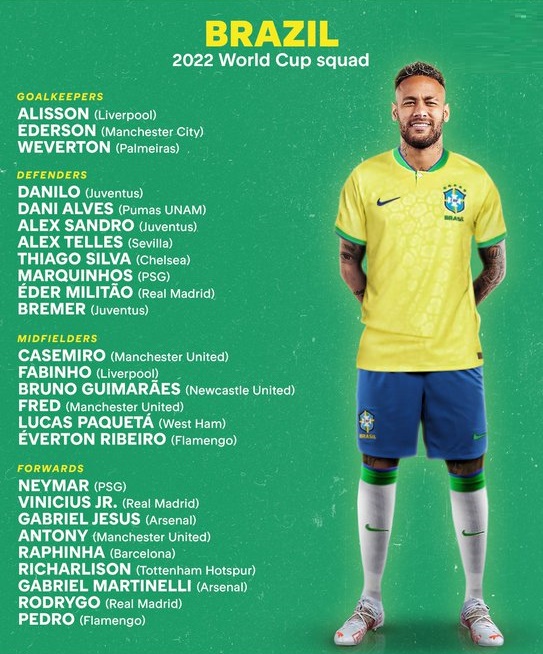 كشف المدرب تيتي، تشكيل منتخب البرازيل الآتي لمواجهة كرواتيا في كأس العالم قطر 2022، بقيادة المهاجم نيمار أساسيًا.