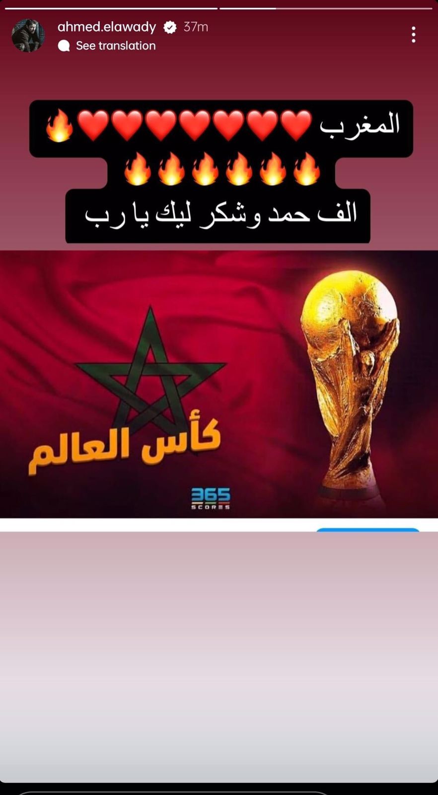 كما كتب أحمد السقا عبر حسابه بموقع إنستجرام: ألف مبروك للمنتخب المغربي الشقيق وللكرة العربية هذا الإنجاز التاريخي بالتأهل لنصف نهائي كأس العالم شرفتونا وفرحتونا.