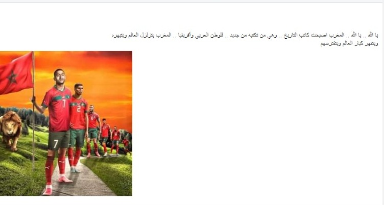 كما نشر أحمد السعدني صورة للعلم المغربي عبر حسابه بموقع إنستجرام، وعلق قائلا: الله عليكم الله أكبر الله يا مغرب ألف ألف مبروك التأهل التاريخي عن جداره واستحقاق لنصف نهائي المونديال.