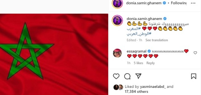 كما تفاعلت الفنانة دنيا سمير غانم بفوز منتخب المغرب، وكتبت عبر حسابها بموقع إنستجرام: مبروك شرفتونا.. المغرب.