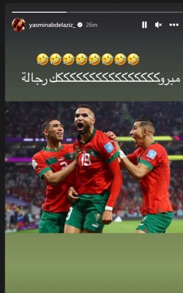 وتفاعلت ياسمين عبد العزيز مع فوز منتخب المغرب اليوم على نظيره البرتغالي، حيث كتبت عبر حسابها بموقع إنستجرام: مبروك.. رجالة.