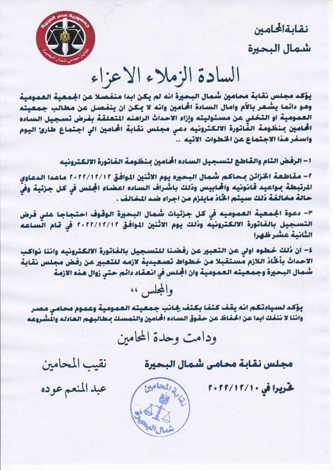 قرارات جديدة بشأن الفاتورة الإلكترونية لمحامي البحيرة