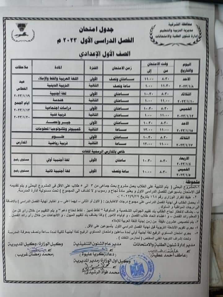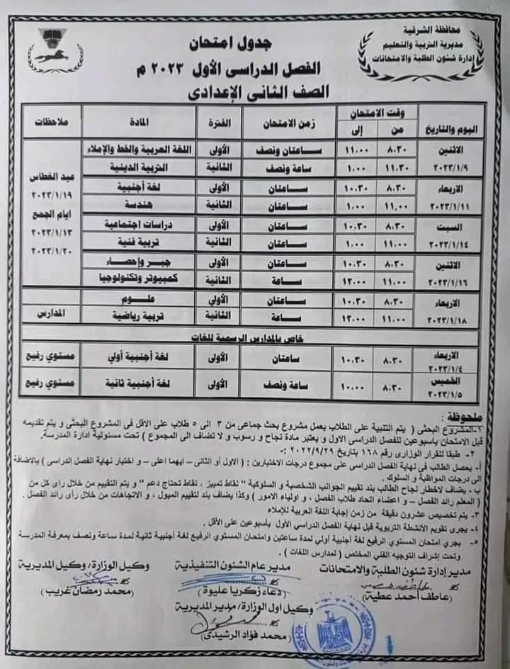 - جدول امتحانات نصف العام 2023 الصف الأول الإعدادي بمدارس الشرقية، من يوم 9 يناير 2023 ويستمر حتى 18 يناير 2023