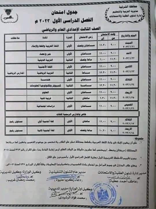 جدول امتحانات الفصل الدراسي الأول 2023 بالشرقية