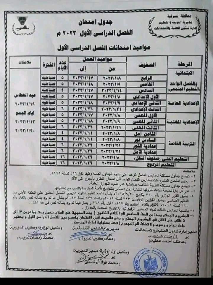 جدول امتحانات الفصل الدراسي الأول 2023 لبعض الصفوف الدراسية بالشرقية | صور