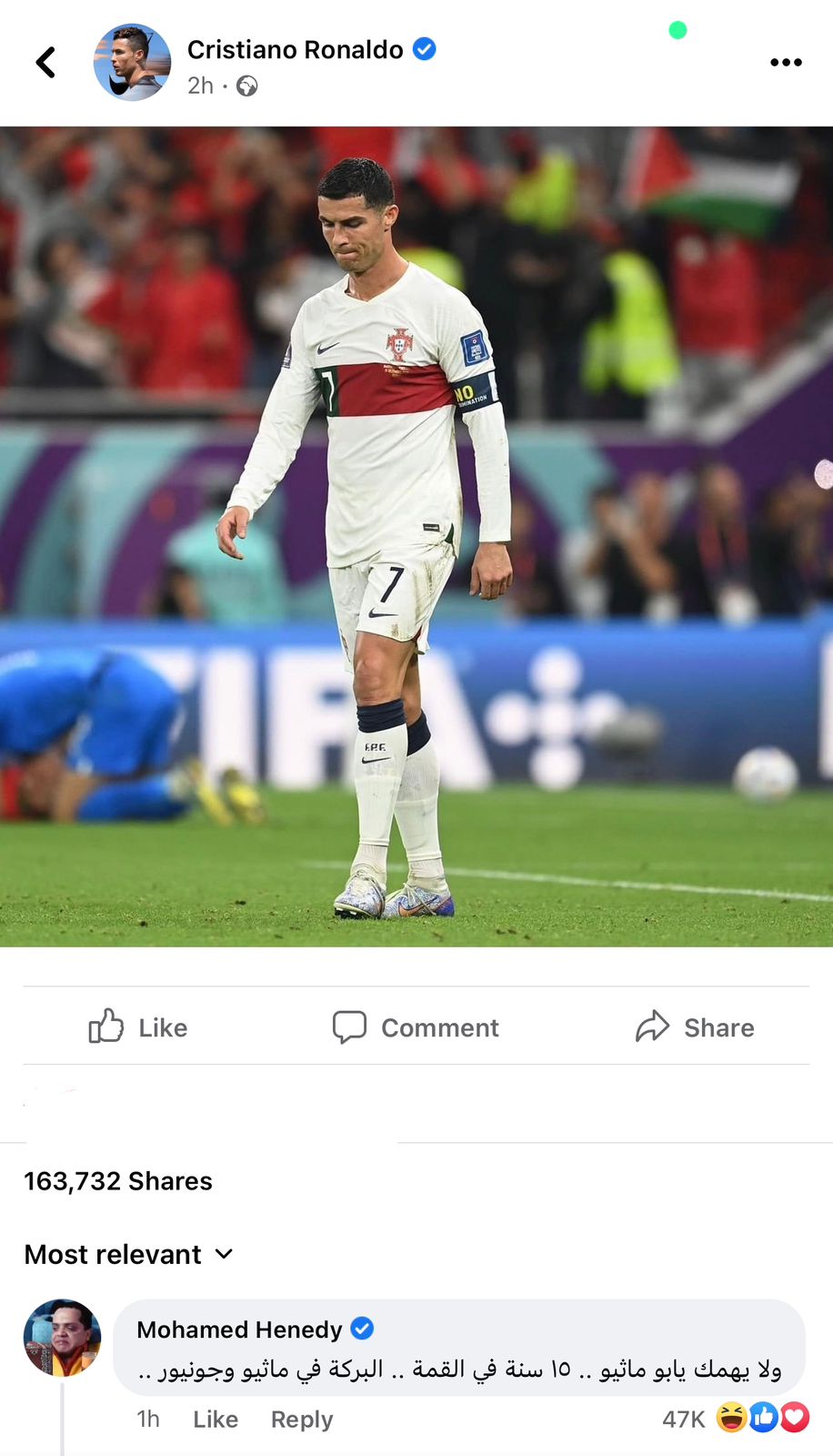 نشر اللاعب البرتغالي كريستيانو رونالدو منشورا على حسابه الشخصي فيسبوك يتحدث فيه عن حزنه بعد رحيل منتخب بلاده من ربع نهائي كأس العالم أمس على يد منتخب المغربي.