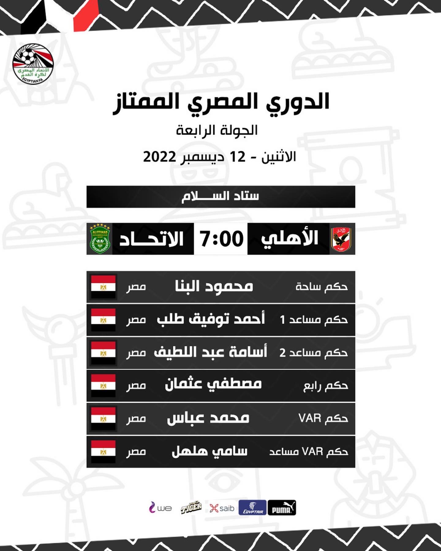 أعلنت لجنة الحكام الرئيسية باتحاد الكرة، أسماء أطقم الحكام المكلفة بإدارة مباريات الغد ضمن منافسات بطولة الدوري الممتاز، وهي المباريات المؤجلة من الجولتين الثالثة والرابعة للبطولة.