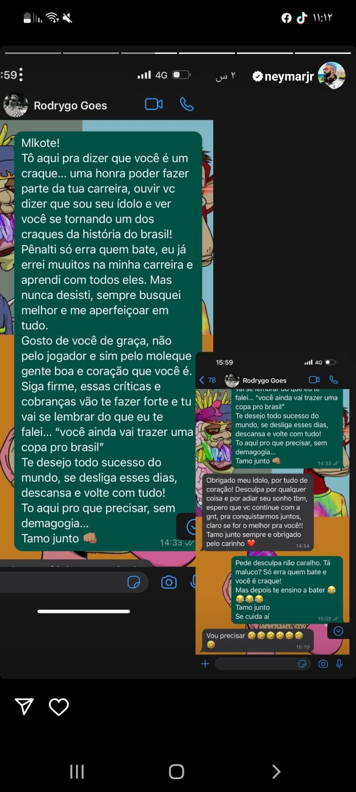 وجاءت رسالة نيمار لرودريجو كالتالي: أنا هنا لأقول إنك نجم، إنه لشرف كبير أن أكون جزءًا من حياتك المهنية، أنا أسمعك تقول إنني مثلك الأعلى وأنا أرى أنك ستصبح أحد النجوم في تاريخ البرازيل، كلنا نضيع ركلات جزاء، لقد أضعت الكثير من ركلات الجزاء في مسيرتي وتعلمت منها جميعًا، لكنني لم أستسلم أبدًا، لقد بحثت دائمًا عن الأفضل وأتقن بنفسي كل شيء، أنت رجل طيب القلب، أبقَ قويًا، هذه الانتقادات والضغوط ستجعلك قويًا، وستتذكر ما قالته لك ما زلت ستحضر كأسًا إلى البرازيل، أتمنى لك كل النجاح في العالم.