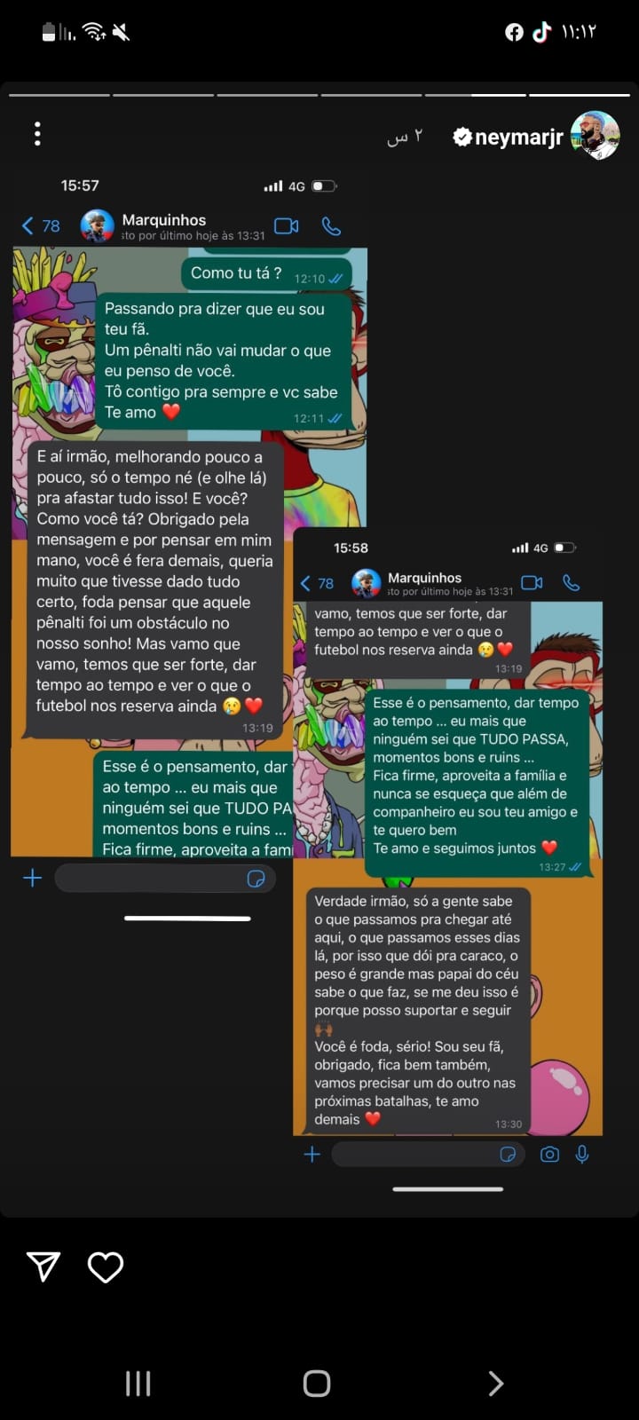 أرسل النجم البرازيلي نيمار جونيور، رسائل خاصة عبر الواتساب لمهدري ركلات الترجيح أمام كرواتيا ضمن منافسات دور ربع نهائي بطولة كأس العالم قطر 2022.