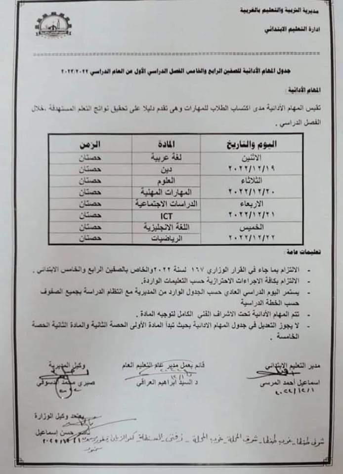 الجدير بالذكرأعلنت مديرية التربية والتعليم بالغربية موعد انعقاد المهام الأدائية للصفين الرابع والخامس الابتدائي، حيث ستبدأ المهام الأدائية في كل المواد الأسبوع المقبل بدءا من الاثنين 19 ديسمبر.
