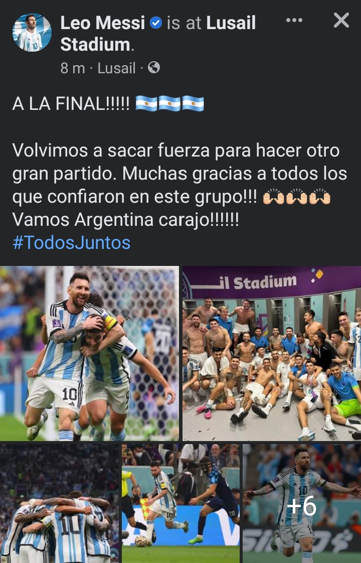 ونشر ليونيل ميسي عبر حسابه الرسمي على موقع التواصل الاجتماعي فيسبوك رسالة تنص على: إلى النهائي، عدنا لنلعب بقوة في مباراة كبرى جديدة، شكرًا جزيلًا لكل من وثق بالمجموعة، لتذهب الأرجنتين بنا جميعا.