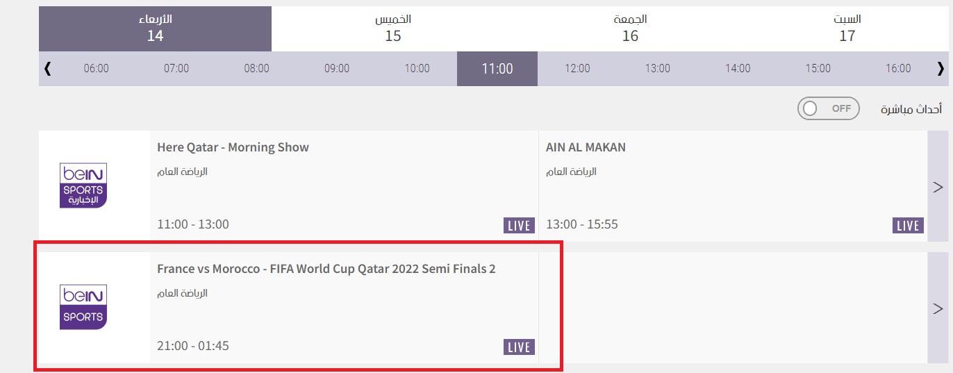 أدرجت بين سبورت مباراة المغرب وفرنسا في نصف نهائي كأس العالم قطر 2022 على قناتها بين سبورت المفتوحة، حسب جدول البث على موقعها الإلكتروني، حيث ستتمكن الجماهير من مشاهدة مباراة المغرب ضد فرنسا بشكل مجاني.
