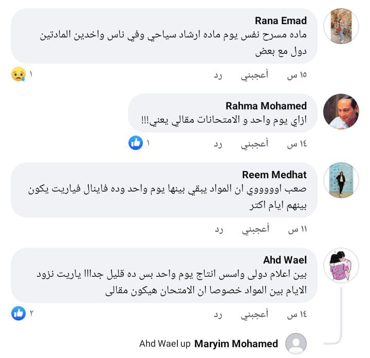 فيما أفادت الطالبة إسراء أيمن، بأن الفرق بين المواد الأساسية قليل جدًا خصوصًا لجروب الصحافة ويوجد به مواد تحتاج وقت أكثر من ذلك، لافتة إلى أن يجب عمل الامتحانات بنظام البابل شيت فقط بدون الأسئلة المقالية إذا أمكن.