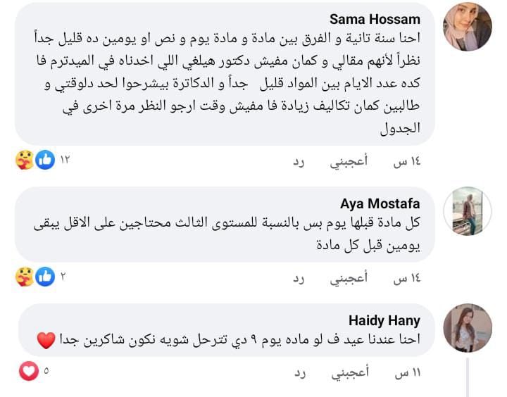 وأوضحت الطالبة غرام عماد، أن مواعيد الامتحانات والجدول غير مناسب بالمرة ويجب أن يكون النظام بابل شيت فقط، لكوننا تحت ضغط شديد طوال الوقت بسبب التكليفات المطلوبة، إلى جانب عدم تمكنا من المذاكرة بطريقة جيدة بسبب المناهج.