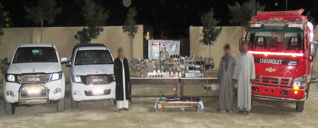 كما تمكنت من ضبط ثلاثة من العناصر الإجرامية لأحدهم معلومات جنائية حال تواجدهم بدائرة قسم شرطة سيدى برانى، وبحوزتهم كمية من مخدر الحشيش وزنت 742 كيلو جرام – عدد 10000 قرص مخدر لعقار الترامادول – 2 بندقية آلية – 5 خزائن - بندقية خرطوش – كمية من الطلقات النارية مختلفة الأعيرة – 3 سيارات إحداهم بدون لوحات – مبلغ مالي عملات محلية وأجنبية – 3 هاتف محمول.