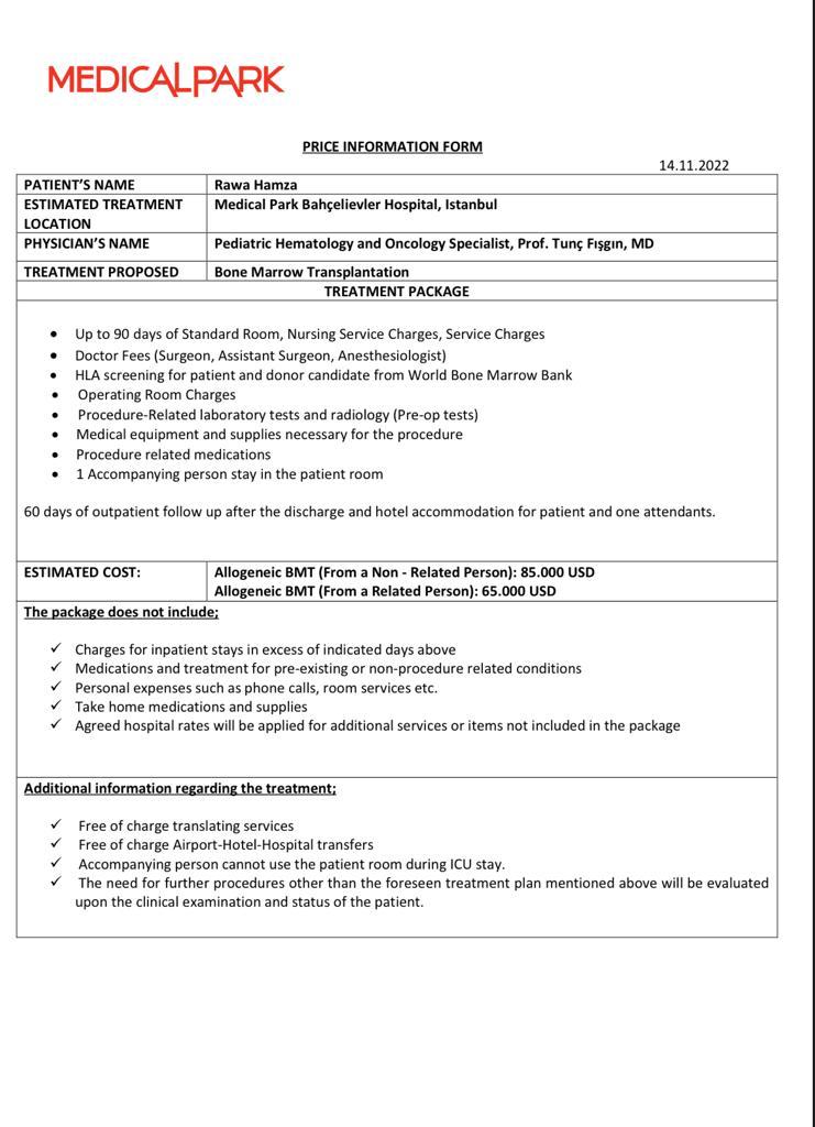 وطالب والد رؤى، بمساعدته لإجراء عملية زرع النخاع لطفلته خارج البلاد، حيث يتوافر في بنوك النخاع الكثير من العينات التي قد تتطابق مع ابنته، وأوضح أن تكلفة مثل هذه العملية في مصر أو خارجها مرتفعة جدا، حيث تصل تكلفة زراعة النخاع المتطابق جزئيًا في مصر إلى مليون جنيه، والتأمين يساعد فقط بـ مبلغ 230 ألف جنيه من المبلغ.