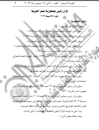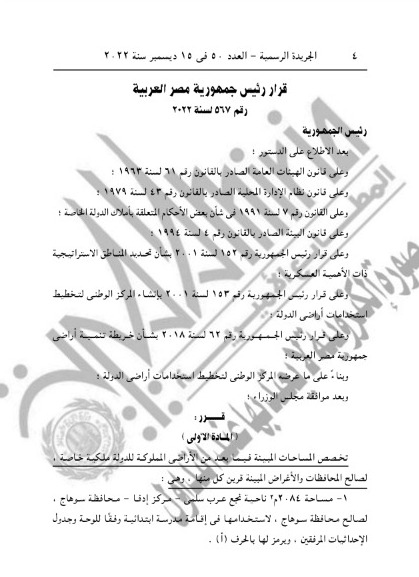 نشرت الجريدة الرسمية في عددها اليوم الخميس، قرارا جمهوريا بشأن تخصيص بعض المساحات من الأراضي المملوكة للدولة ملكية خاصة لصالح المحافظات لاستخدامها فى بعض الأغراض.