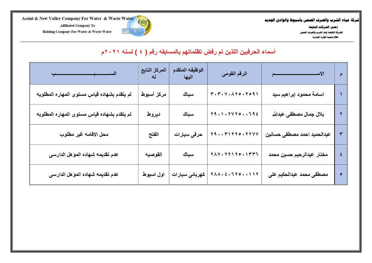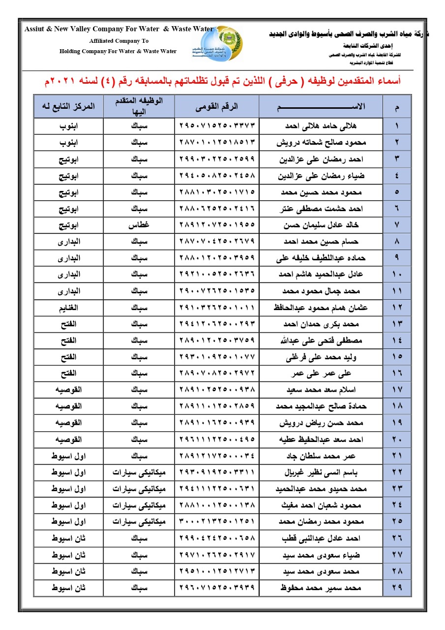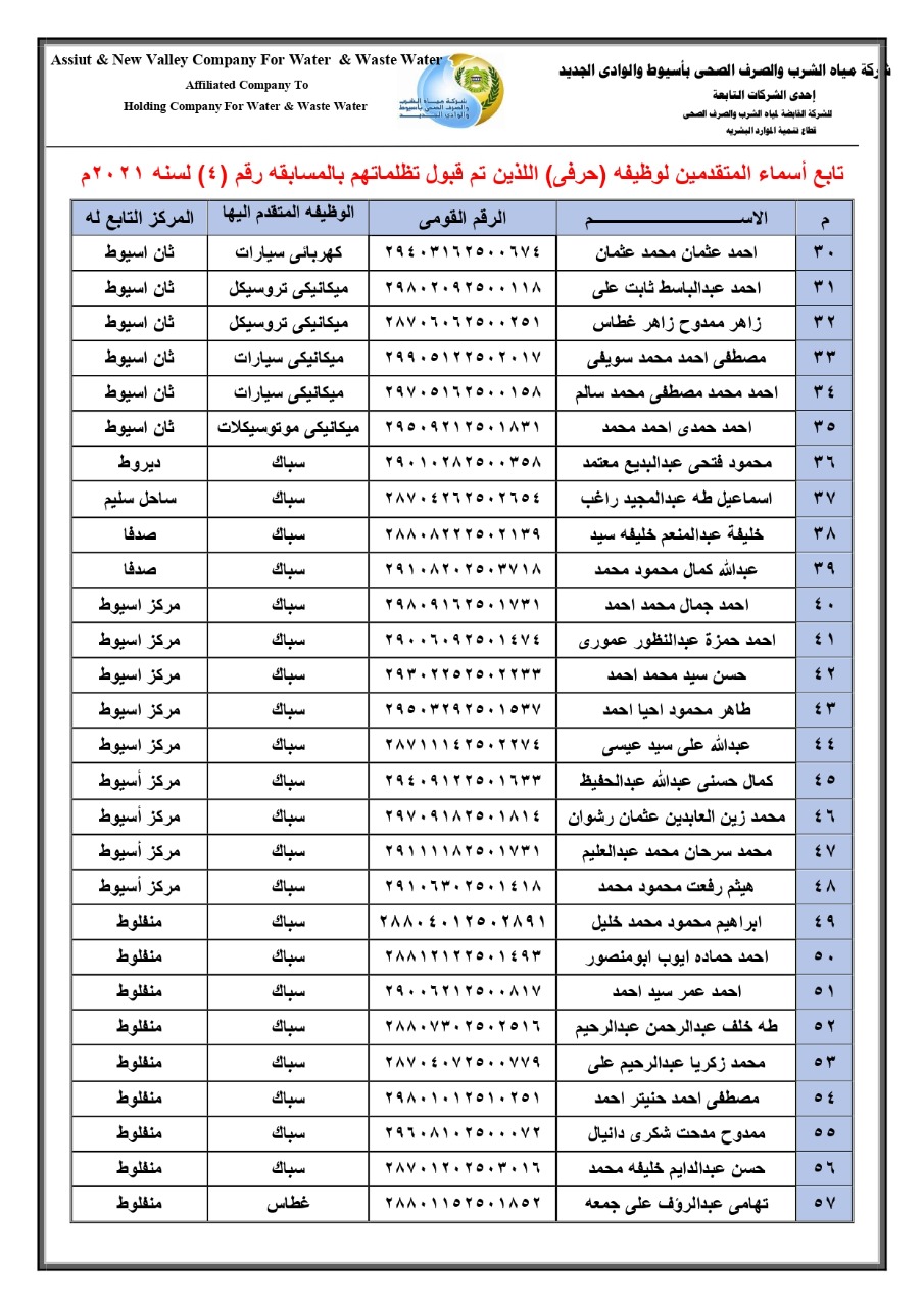 وفي سياق سابق أعلنت شركة مياه الشرب والصرف الصحي بأسيوط والوادي الجديد، أسماء المنطبق عليهم الشروط لشغل وظيفة حرفي بالمسابقة رقم 4 لعام 2021م لمحافظة أسيوط، وسيتم إجراء الاختبارات لهم خلال الفترة القادمة.