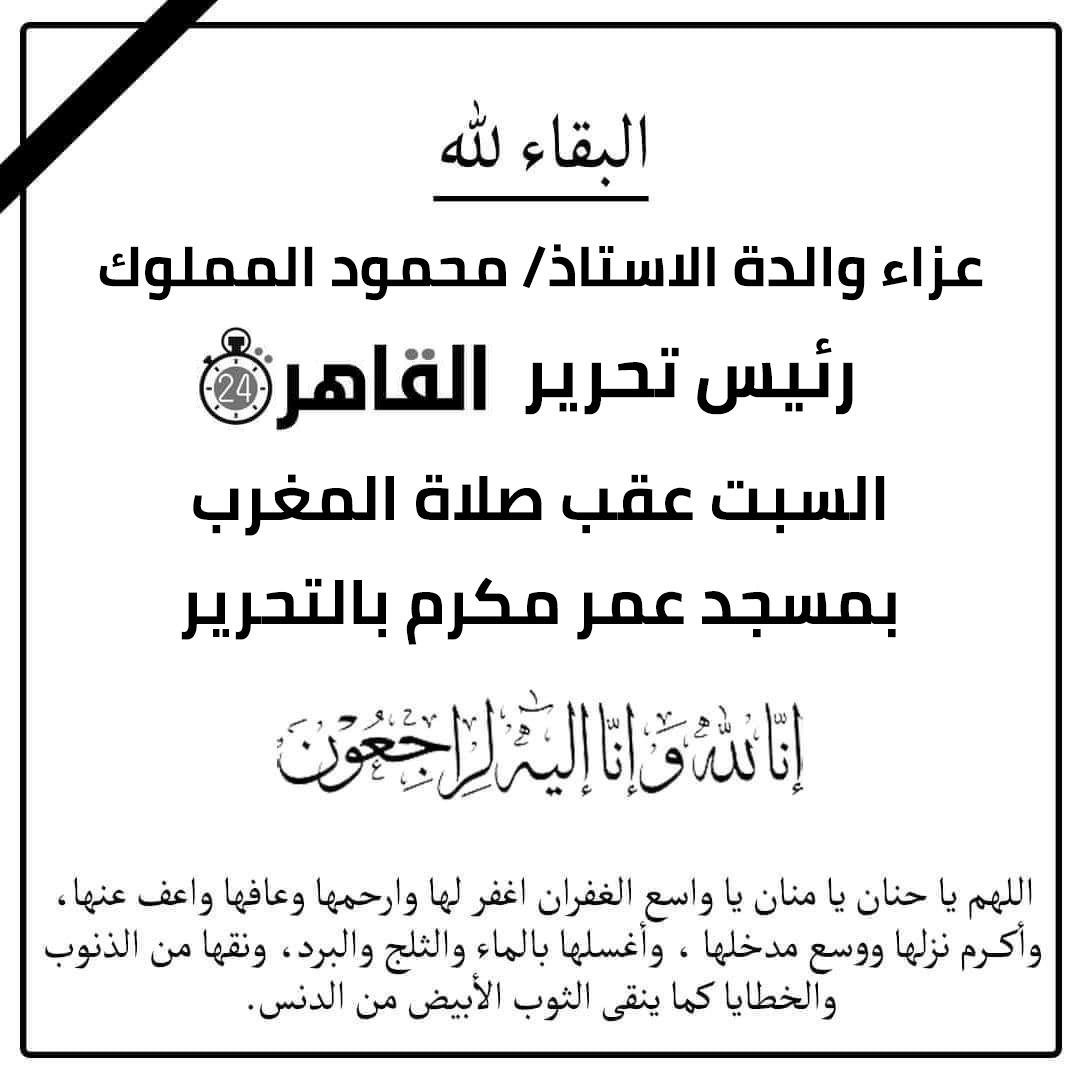 يقام يوم السبت المقبل عزاء والدة محمود المملوك، رئيس تحرير “القاهرة 24” عقب صلاة المغرب بمسجد عمر مكرم بميدان التحرير.