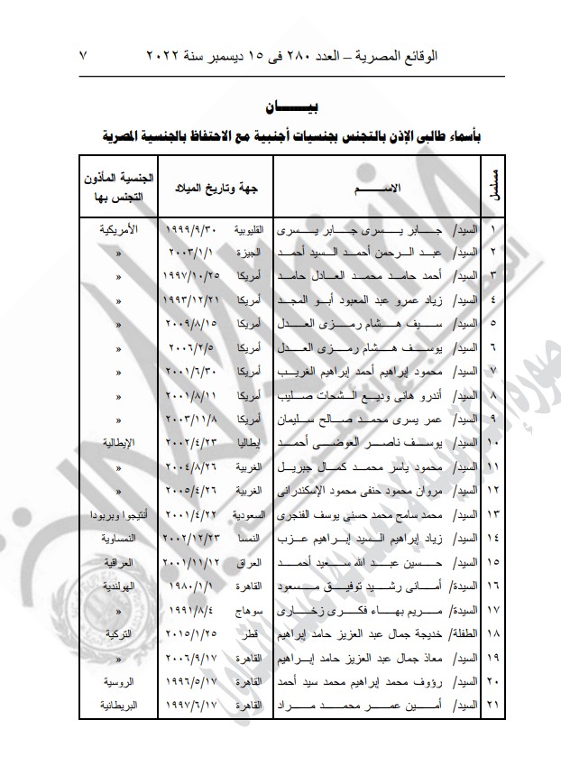 نشرت جريدة الوقائع المصرية في العدد الصادر برقم 280، قرار اللواء محمود توفيق، وزير الداخلية، الذي حمل رقم 2303 لسنة 2022، بأن يُؤذن لكل من الواحد وعشرين مواطنا أولهم جابر يسرى جابر يسرى، وآخرهم أمين عمر محمد مراد، المدرجة أسماؤهم بالبيان المرفق، بالتجنس بالجنسية الأجنبية الموضحة قرين اسم كل منهم، مع احتفاظهم بالجنسية المصرية.