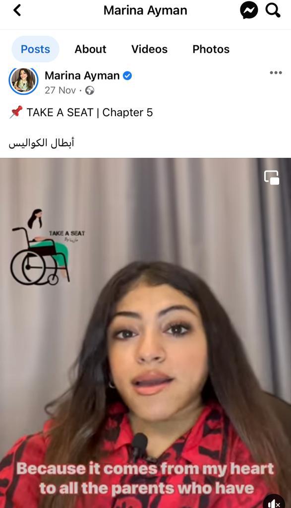 وأوضحت مارينا: أقوم بدعم أصحاب الإعاقات، لأني مجربة وعارفة كويس اللي بيحسوا بيه، وأنا أعد بنفسي كتابة محتوى الفديوهات، كما أقوم بكافة أعمال المونتاج والتجهيز له.