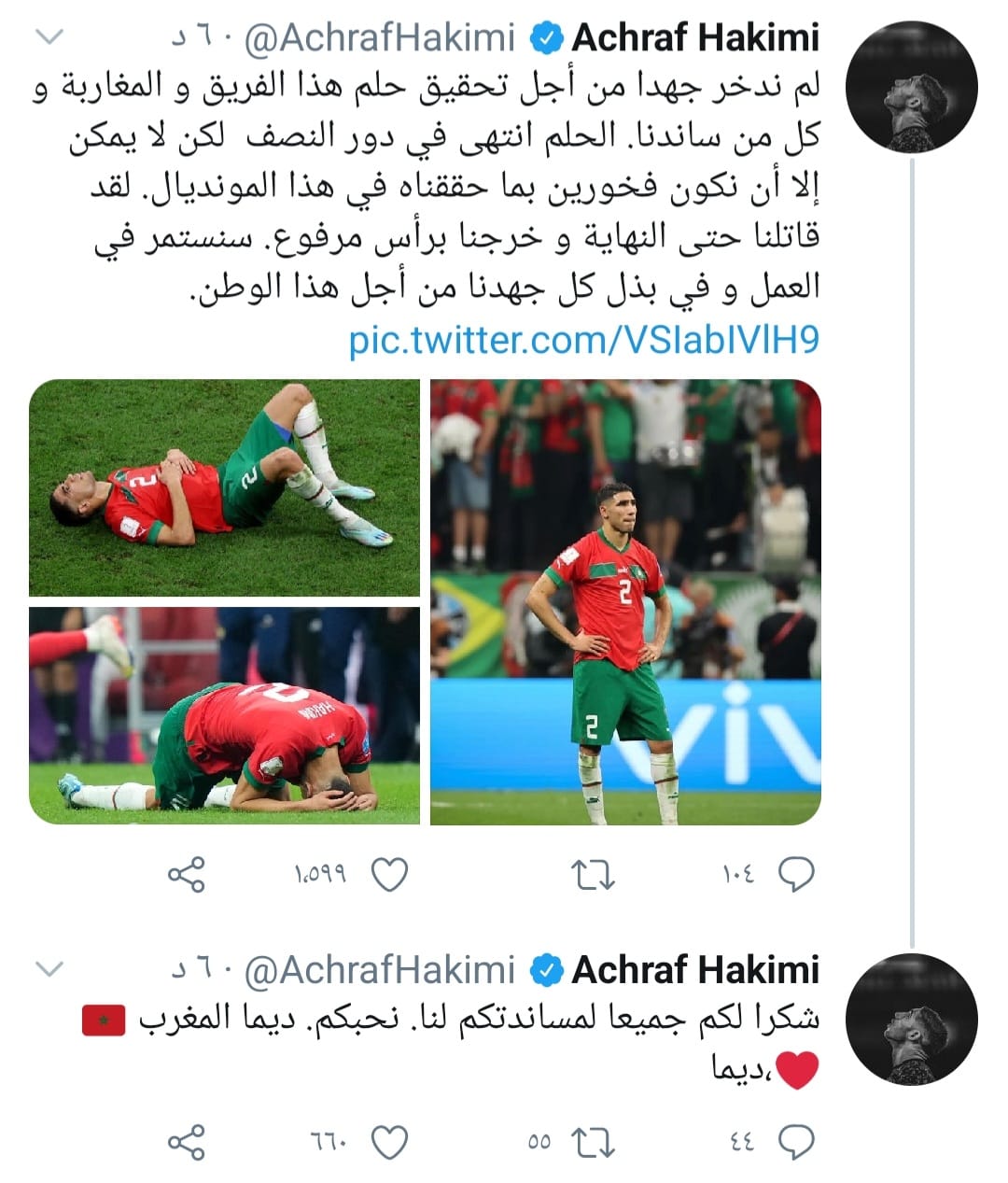 وقال حكيمي: لم ندخر جهدا من أجل تحقيق حلم هذا الفريق والمغاربة وكل من ساندنا.. الحلم انتهى في دور النصف لكن لا يمكن إلا أن نكون فخورين بما حققناه في هذا المونديال.. لقد قاتلنا حتى النهاية وخرجنا برأس مرفوع. سنستمر في العمل وفي بذل كل جهدنا من أجل هذا الوطن.