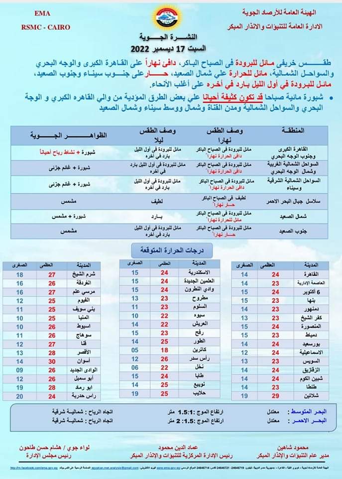 كشفت الهيئة العامة للأرصاد الجوية، تفاصيل حالة الطقس التي تشهدها المدن المصرية، اليوم السبت، الموافق 17 ديسمبر لعام 2022، لذلك يحرص القاهرة 24 على تقديم موجز أخبار الطقس للمواطنين وكذلك درجات الحرارة.