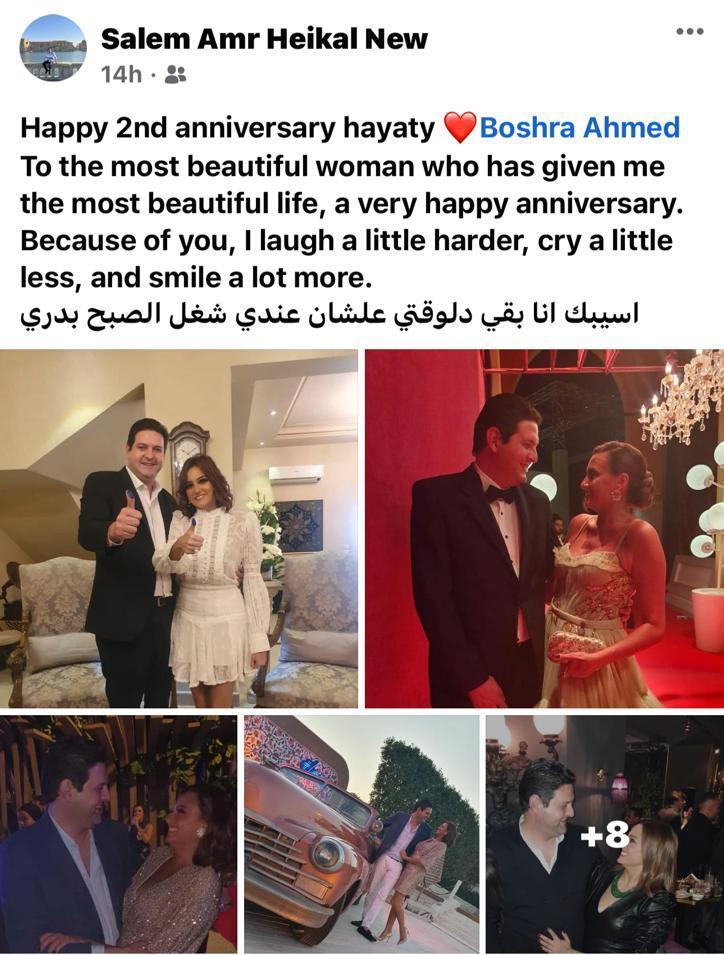 وجه زوج الفنانة بشرى رسالة حب لها، في عيد زواجهما الثاني، عبر صفحته الشخصية على موقع التواصل الاجتماعي فيس بوك، ونشر مجموعة من الصور لهما وعلق عليها قائلًا: عيد زواج سعيد يا حياتي أجمل إمرأة التي منحتني أجمل حياة.