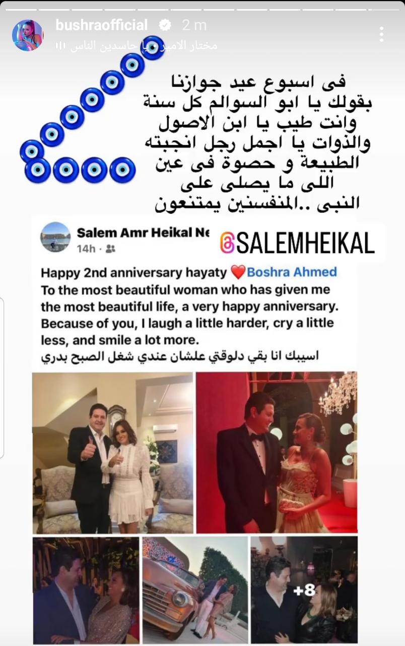 وردت بشرى عبر صفحتها الشخصية على موقع تبادل الصور والفيديوهات القصرة انستجرام، حيث أعادت نشر تدوينته وعلقت عليها قائلة: في أسبوع عيد جوازنا بقولك يا أبو السوالم، كل سنة وأنت طيب يا أبن الأصول والذوات، يا أجمل رجل أنجبته الطبيعة، وحصوة في عين اللي ما يصلي على النبي.. المنفسنين يمتنعون.