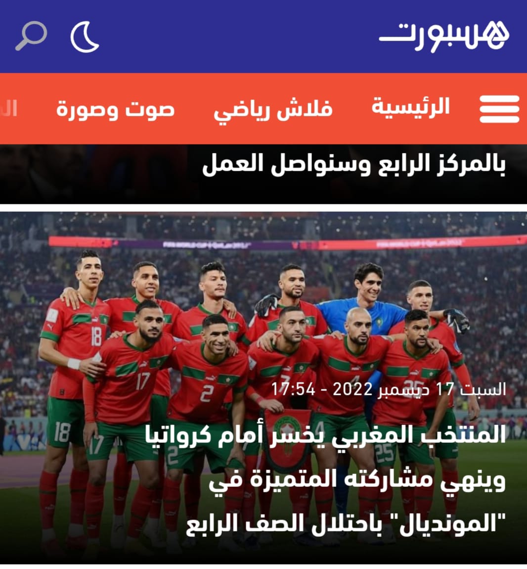 عنونت صحيفة هسبورت المغربية، قائلة: المنتخب المغربي يخسر أمام كرواتيا وينهي مشاركته المتميزة في "المونديال" باحتلال الصف الرابع.