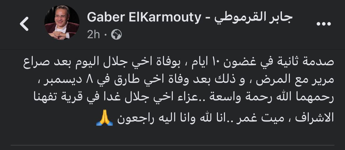 الإعلامي جابر القرموطي يُعلن عن وفاة شقيقه جلال بعد صراع مع المرض