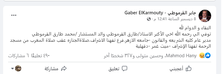 أخي الأكبر الأستاذ/طارق القرموطي والد المستشار/ محمد طارق القرموطي مدير عام كلية الشريعة والقانون - جامعه الأزهر. فرع تفهنا الأشراف. وصلاة الجنازة عقب صلاة المغرب من مسجد الرحمة تفهنا الأشراف -ميت غمر - دقهلية).