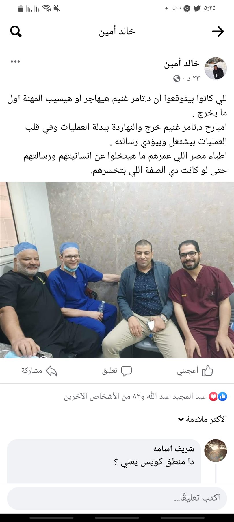 وقال الدكتور خالد أمين في منشوره على صفحته الشخصية على موقع التواصل الاجتماعي فيس بوك: "للي كانوا بيتوقعوا أن دكتور تامر غنيم هيهاجر أو هيسيب المهنة أول ما يخرج، امبارح خرج والنهاردة ببدلة العمليات وفي قلب العمليات بيشتغل وبيؤدي رسالته".