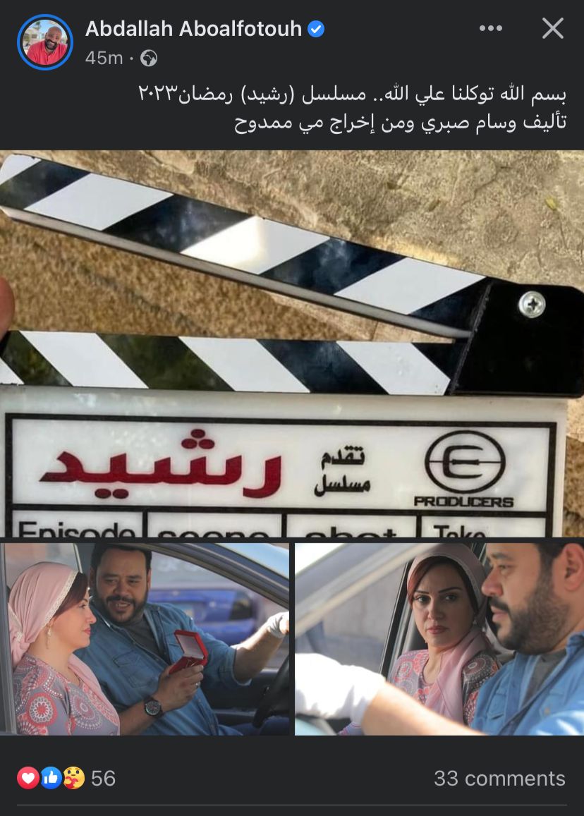 ونشر عبدالله أبو الفتوح، صورًا من كواليس العمل، عبر حسابه الشخصي بموقع التواصل الاجتماعي فيسبوك، حيث كتب: بسم الله توكلنا على الله.. مسلسل (رشيد) رمضان 2023.. تأليف وسام صبري ومن إخراج مي ممدوح.
