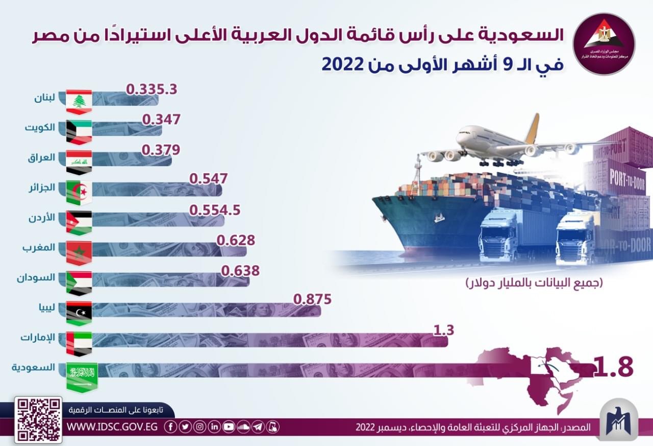 وجاءت السعودية على رأس قائمة أعلى عشر دول عربية استيرادا من مصر؛ حيث بلغت قيمة صادرات مصر لها 1.8 مليار دولار، تليها الإمارات 1.3 مليار دولار، ثم ليبيا بنحو 875 مليون دولار.