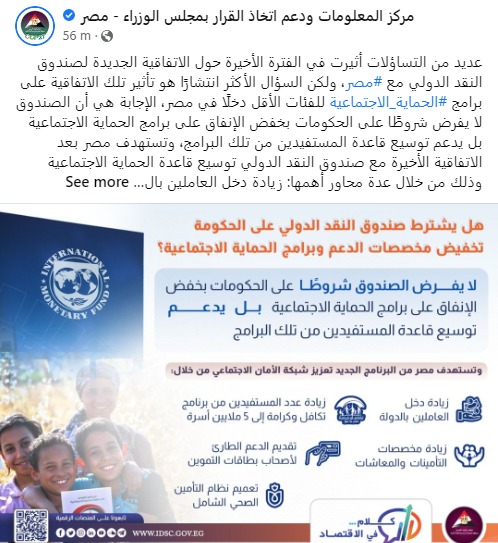 وأعلن مركز المعلومات، عبر صفحته على موقع التواصل الاجتماعي، فيسبوك، أن مصر تستهدف بعد الاتفاقية الأخيرة مع صندوق النقد الدولي توسيع قاعدة الحماية الاجتماعية، وذلك من خلال عدة محاور أهمها: زيادة دخل العاملين بالدولة وزيادة مخصصات التأمينات الاجتماعية والمعاشات وزيادة عدد المستفيدين من برنامج تكافل وكرامة إلى 5 ملايين.