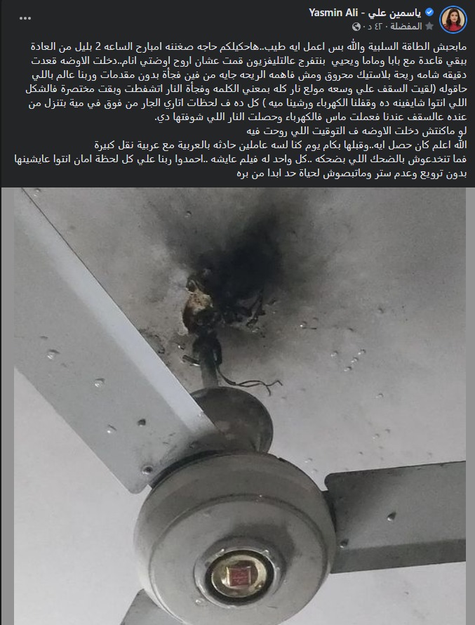 ونشرت ياسمين علي، صورة لسقف غرفتها ظهر به آثار الحريق، وذلك عبر حسابها الشخصي بموقع فيسبوك، وعلقت قائلة: ما بحبش الطاقة السلبية والله بس اعمل إيه طيب.. هاحكيلكم حاجة صغننة.. امبارح الساعه 2 بليل من العادة ببقى قاعدة مع بابا وماما ويحيى بنتفرج على التليفزيون.. قمت عشان أروح أوضتي أنام.