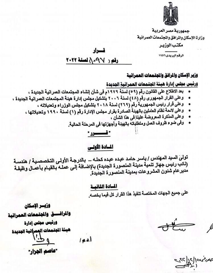أصدر الدكتور عاصم الجزار وزير الإسكان والمرافق والمجتمعات العمرانية الجديدة قرارًا رقم 1097 لسنة 2022، بتولى المهندس ياسر حامد عبده عبده كحلة - بالدرجة الأولى التخصصية هندسة نائب رئيس جهاز تنمية مدينة المنصورة الجديدة بالإضافة إلى عمله بالقيام بأعمال وظيفة مدير عام شئون المشروعات بمدينة المنصورة الجديدة.