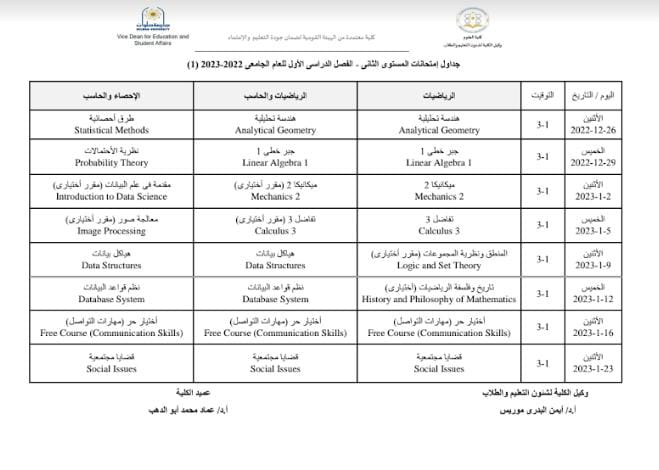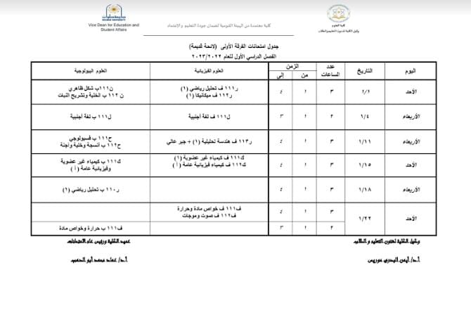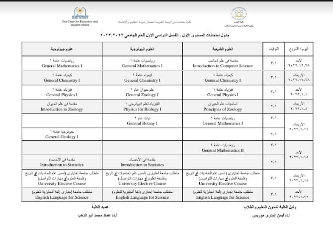 أعلنت كلية العلوم بـ جامعة حلون، جداول امتحانات الفصل الدراسي الأول للعام الدراسي الحالي 2022-2023، وذلك بعد إجراء بعض التعديلات عليها بناءً على رغبة الطلاب، مشيرة إلى أن الامتحانات سوف تعقد حضوريًا وسط إجراءات احترازية مشددة ووقائية حفاظًا على صحة وسلامة الجميع.