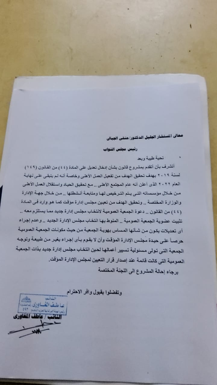 وحصل موقع القاهرة 24، على تعديل قانون تنظيم ممارسة العمل الأهلي، المقدم من النائب عاطف مغاوري، وذلك بعد أن تمت إحالته من المستشار الدكتور حنفي جبالي، رئيس المجلس إلى اللجان المختصة، بهدف مناقشته قبل أن يصبح أحد التعديلات السارية على القانون.