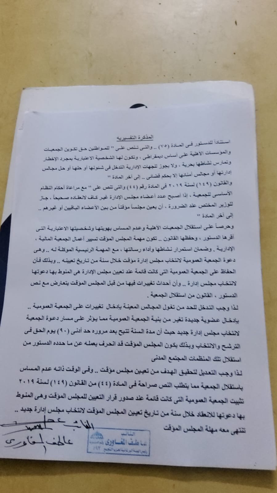 ونص التعديل على قانون تنظيم ممارسة العمل الأهلي، أنه تكون مهمة المجلس المؤقت؛ تسيير أعمال الجمعية المالية الإدارية، وذلك مع ضمان استمرار نشاطها وأداء رسالتها، مع المهمة الرئيسية الموكلة له، وهي دعوة الجمعية العمومية لانتخاب مجلس إدارة مؤقت خلال سنة من تاريخ تعيينه، وبذلك فان الحفاظ على الجمعية العمومية التي كانت قائمة عند تعيين مجلس الإدارة، هي المنوط بها دعوتها لانتخاب مجلس إدارة جديد، وليست المؤقنة، وأن أحداث تغييرات فيها من قبل المجلس المؤقت يتعارض مع نص الدستور.