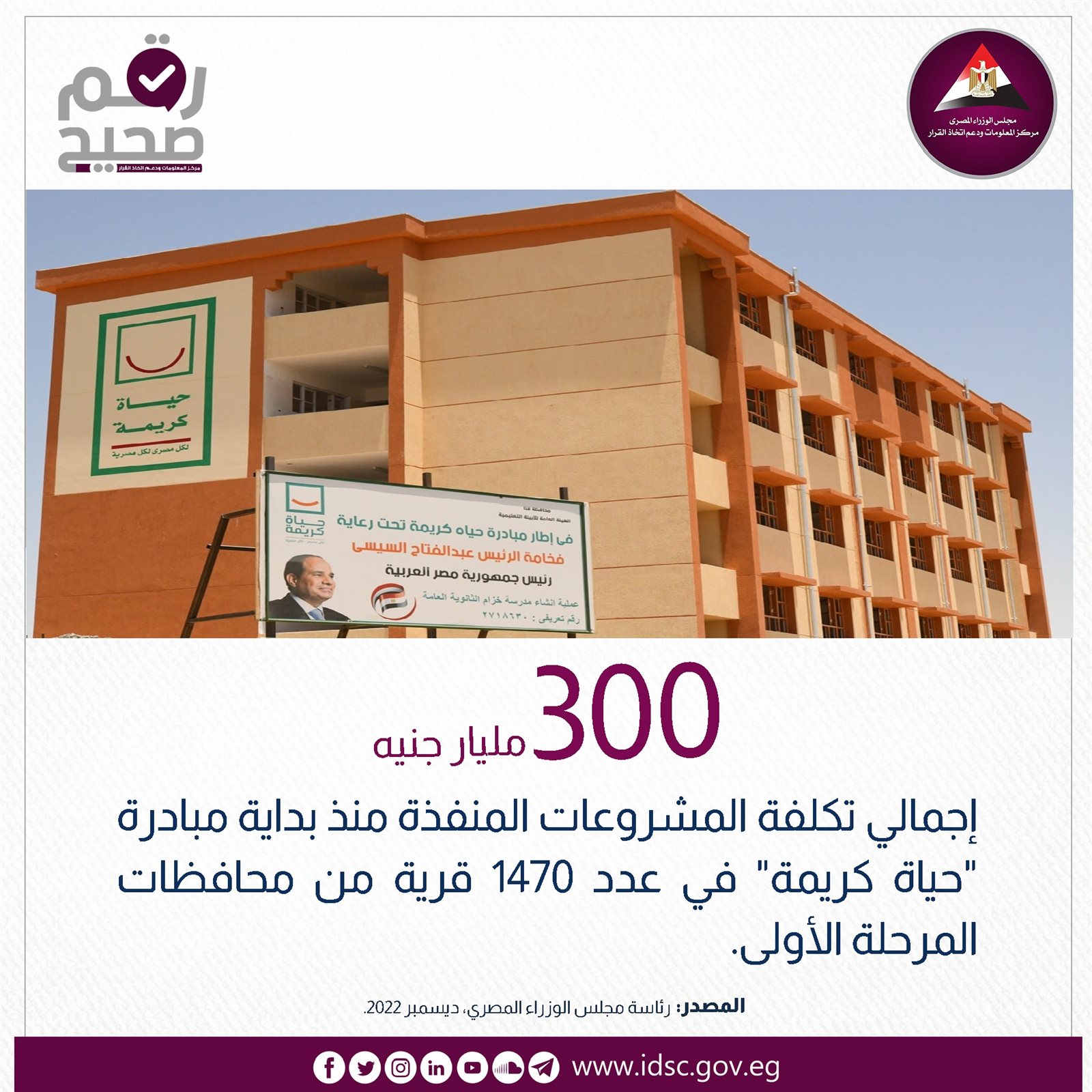 وأكد مركز المعلومات، عبر صفحته الرسمية على موقع التواصل الاجتماعي فيسبوك، أن 300 مليار جنيه، هي إجمالي تكلفة المشروعات المنفذة منذ بداية مبادرة حياة كريمة في عدد 1470 قرية من محافظات المرحلة الأولى.
