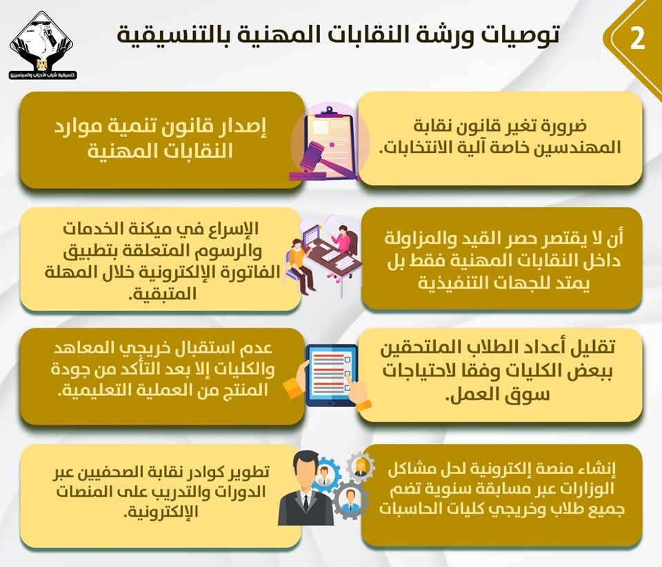 كما أوصت ورشة تنسيقية شباب الأحزاب والسياسيين، بتقليل أعداد الطلاب الملتحقين ببعض الكليات وفقا لاحتياجات سوق العمل، وعدم استقبال خريجي المعاهد والكليات إلا بعد التأكد من جودة المنتج من العملية التعليمية، مع إنشاء منصة إلكترونية لحل مشاكل الوزارات عبر مسابقة سنوية تضم جميع طلاب وخريجي كليات الحاسبات، بالإضافة إلى تطوير كوادر نقابة الصحفيين عبر الدورات والتدريب على المنصات الإلكترونية، وميكنة الخدمات المتعلقة بالفاتورة الإلكترونية ومراعاة احتياجات سوق العمل عند قبول الطلاب بالكليات.