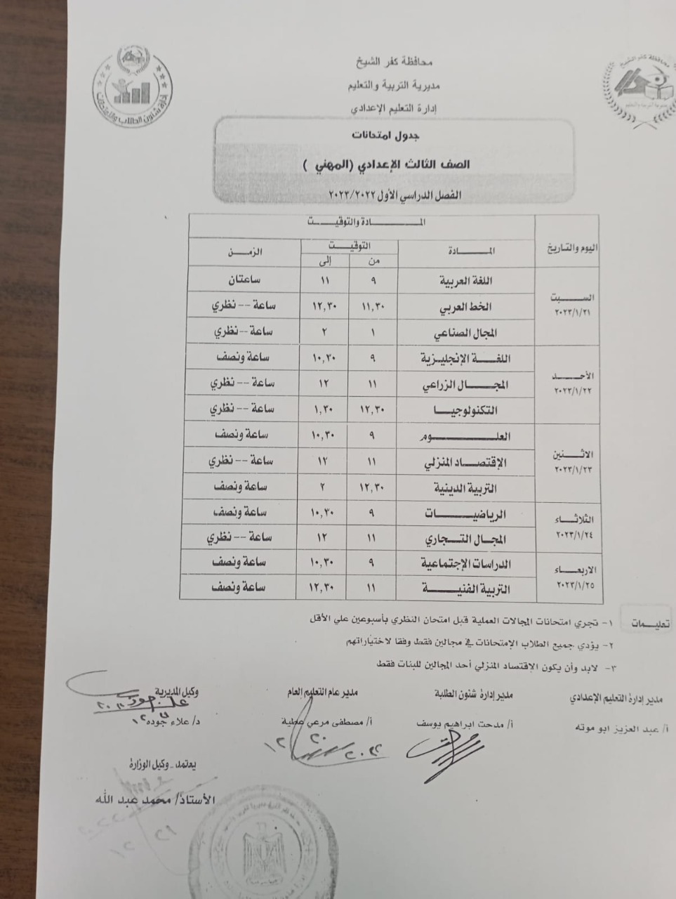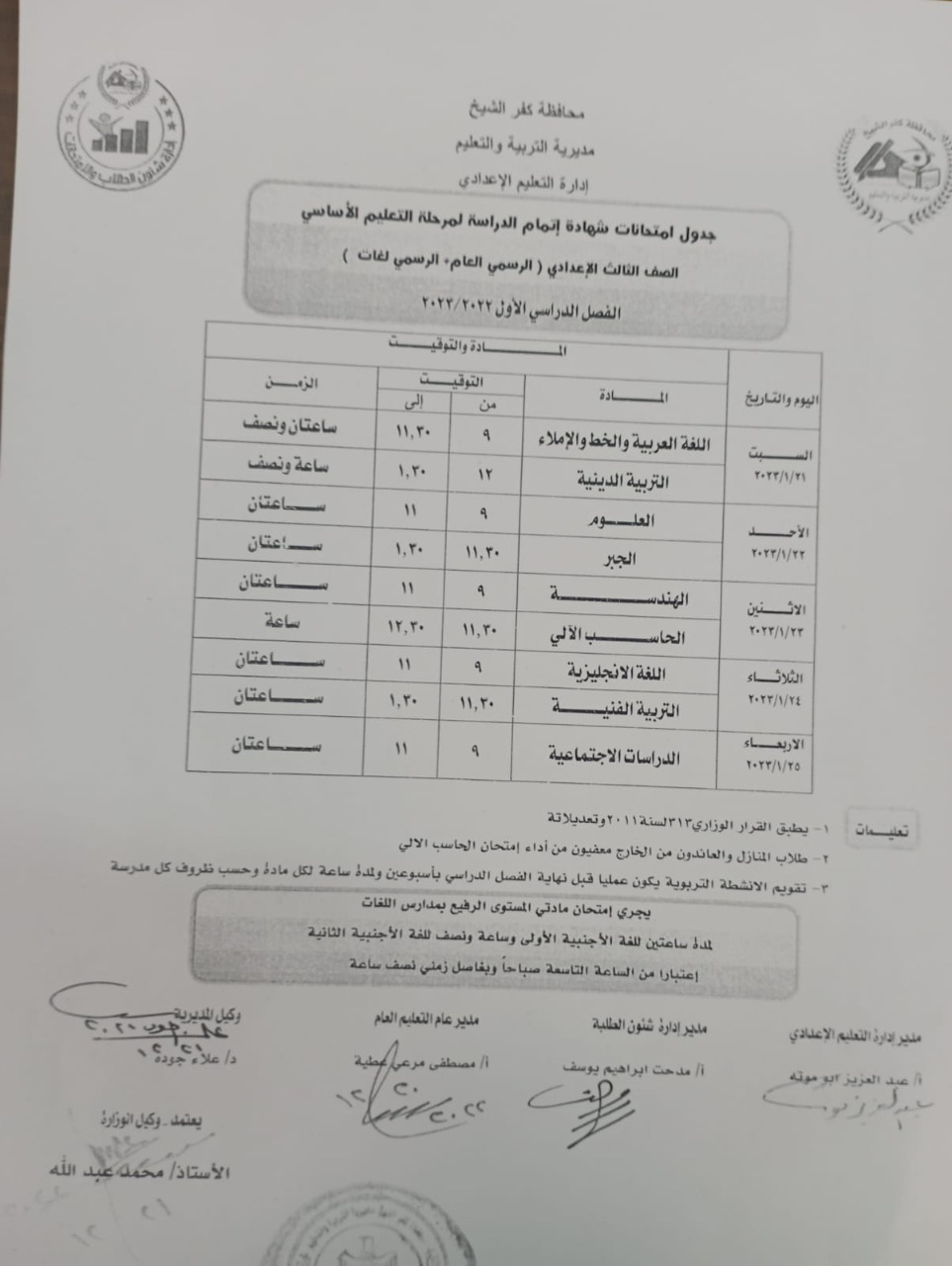 جدول امتحانات الصف الثالث الإعدادي في محافظة كفر الشيخ: