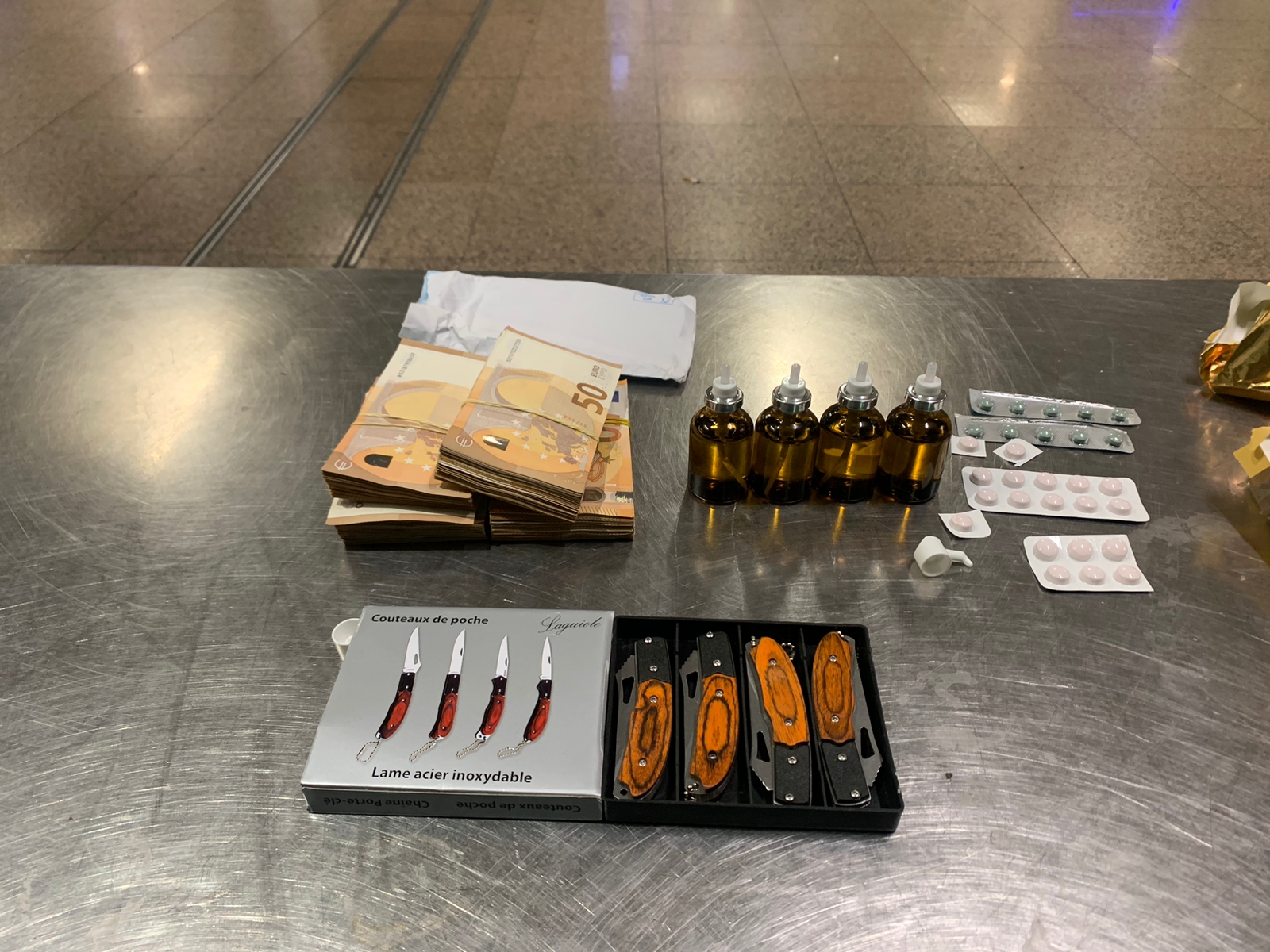 أسلحة بيضاء ومخدرات.. ضبط راكبين بحوزتهما عملة أجنبية مخبأة داخل عبوات شيكولاته بمطار القاهرة الدولي | صور