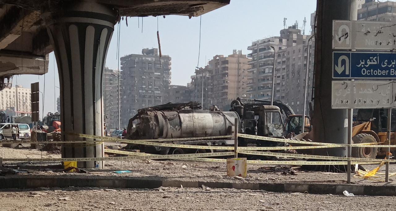 وتصاعد الدخان من آثار حريق الكوبري، بعدما التهمت النيران سياراتين وحفارًا أسفل كوبري الجنزوري نزلة النادي الأهلي، إثر قيام حفار بكسر ماسورة غاز بمحيط الكوبري، مما أدى إلى اشتعال الحريق الذي أسفر عن وفاة 3 أشخاص.