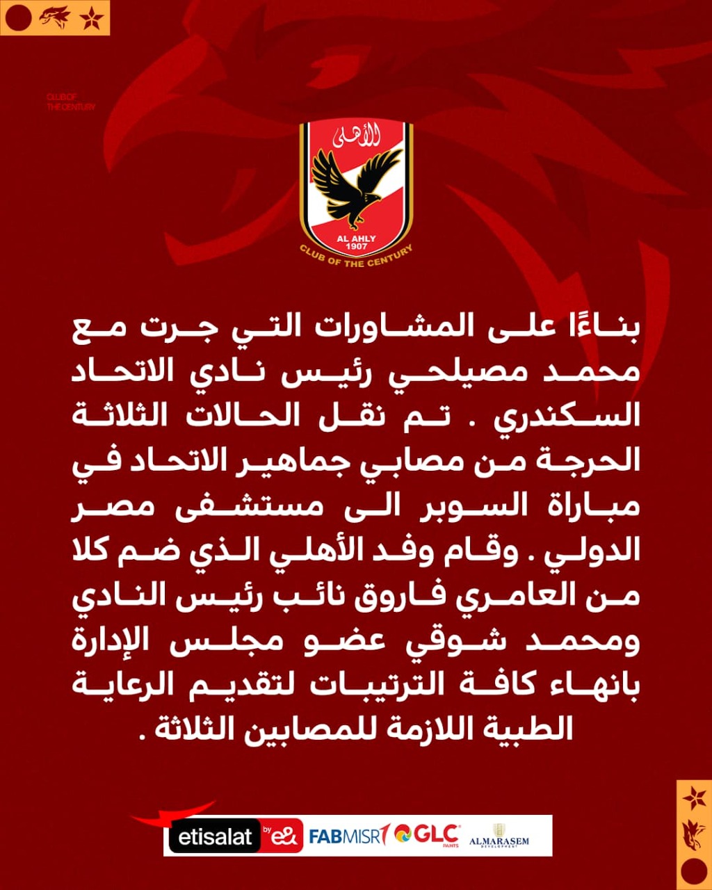وقال النادي الأهلي في بيان رسمي: بناءًا على المشاورات التي جرت مع محمد مصيلحي رئيس نادي الاتحاد السكندري تم نقل الحالات الثلاثة الحرجة من مصابي جماهير الاتحاد في مباراة السوبر إلى مستشفى مصر الدولي.