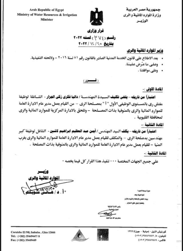 أصدر الدكتور هاني سويلم وزير الموارد المائية والري، بإعفاء مفتش ري بالمستوى الوظيفي الأول بمصلحة الري في القليبوية، من منصبها وتكليف مفتش جديد.