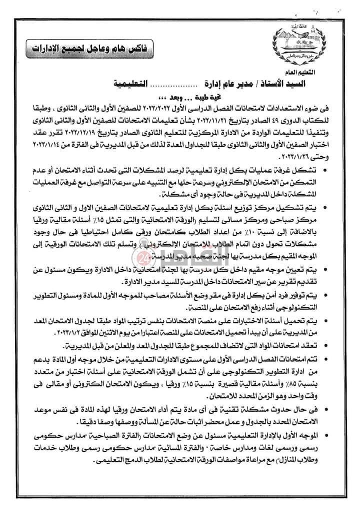تعليم الجيزة توجه تعليمات مهمة بشأن امتحانات طلاب الصفين الأول والثاني الثانوي 2023 | مستند